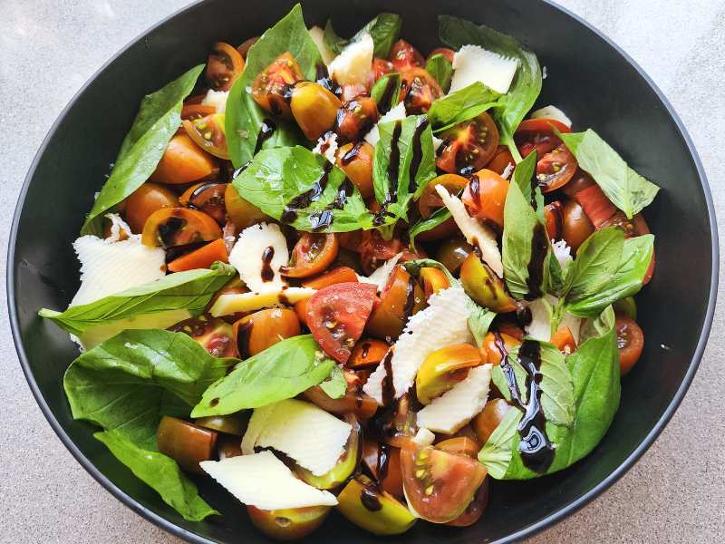 סלט איטלקי קלאסי בגרסה צבעונית ומרעננת, שמשלב עגבניות שרי מתוקות, גבינת מוצרלה רכה, בזיליקום טרי ונגיעת בלסמי מצומצם.
